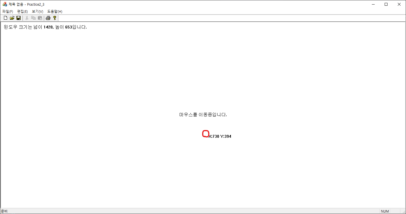 다음과 같은 결과를 얻을 수 있다. 빨간 동그라미에 마우스가 존재하며 마우스를 따라다니며 좌표가 갱신된다.