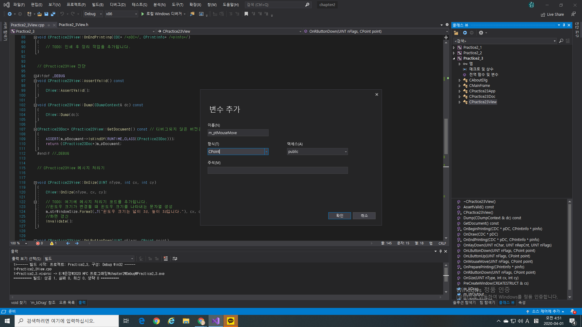 1) 가장 먼저 m_ptMouseMove 라는 변수를 추가한다. 자료형은 CPoint형.