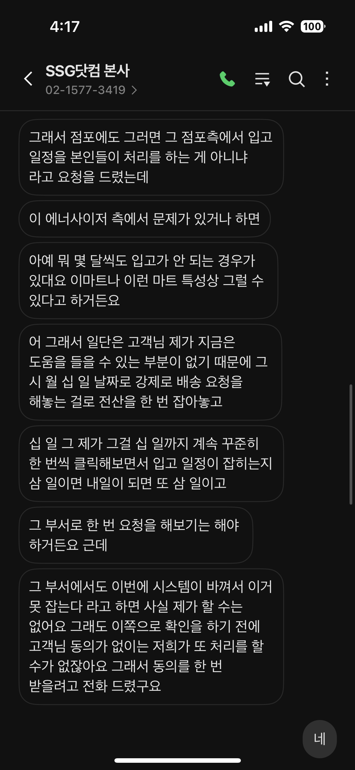 마트 특성 상 그럴 수 있고, 부서에서 시스템이 바뀌었기 때문에 강제로 배송 처리 하고 다시 검토하고 이것도 안될 수 있단다.